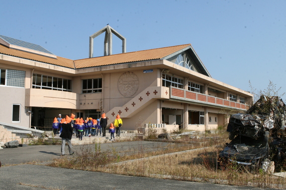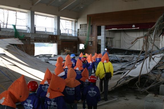 LCAの校長先生が中浜小の校長先生に会いに行って話をして、LCAの3年生に何ができるか聞いてくれました。中浜小の校長先生は、LCAの子どもたちにぜひ被災した学校の校舎に来てそこに立って欲しいと言ってくれました。