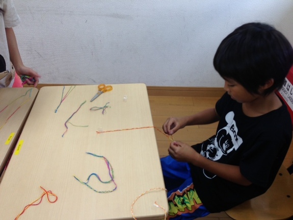子どもたちは楽しみながらミサンガ作りに取り組んでいます。
