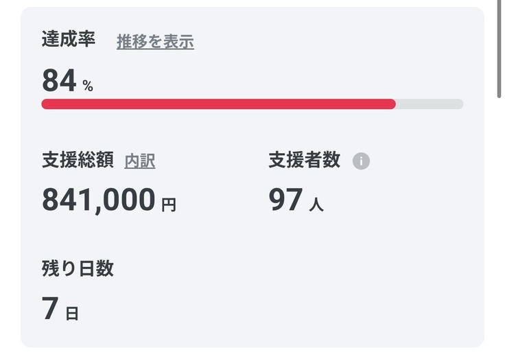 現在97名の方からご支援いただき、84%の達成率となりました。