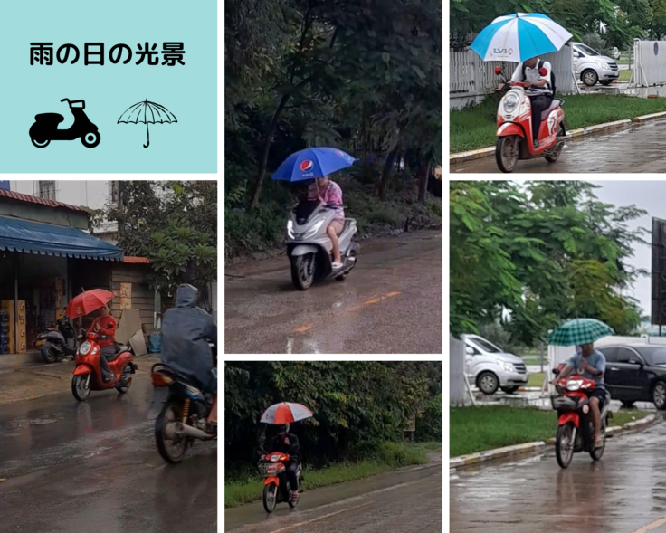 ラオスの人たちはというと、合羽派🧥と傘派☂がいます。オートバイで傘!?と思われると思いますが、こちらでは普通に、そう、あまりにも普通に見かけるので、これが日本ではあり得ないということをすっかり忘れていたほどでした。写真のように器用に傘をさして上手に運転しています。