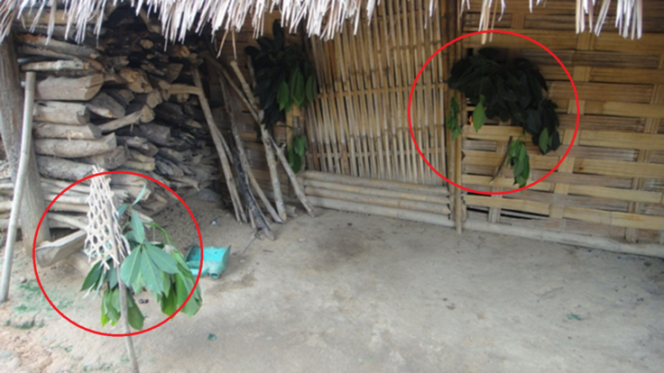 この写真は病を治すために祈祷師が儀式をしたあとの印(赤で囲った部分)として、扉と家の前に草というか小枝を掲げているものです。ラオスでは民族によって様々な独自の習慣や信じていることがあります。