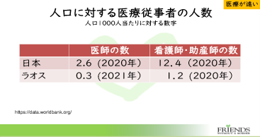 この写真はある郡病院の分娩室です。写真では不明瞭ですが、近くで見ると血液がついて、枕はとても汚れていました。一度も換えたことがないのでは・・と思うほど。このようなところへ行ってお産をしたいかどうか、もし、交通費を使って頑張って病院へ行っても良くならないなど、満足した医療が提供されなければ二度と足を運ぶこともなくなってしまうかもしれないですよね。医療の質として、実際の医療従者数も日本に比べると少ないということがこの表から分かるかと思います。