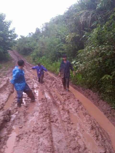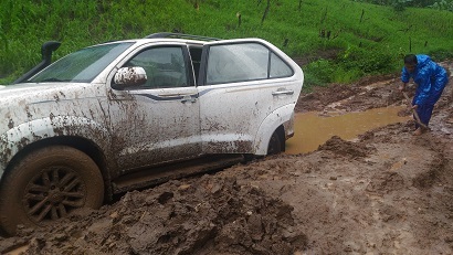 訪問の帰り道。徒歩でもどる途中で、ものすごいスコールに見舞われて、ぐちゃぐちゃ。洋服が雨でずっしりと重たくなり全部脱ぎ捨て、カッパの下は素っ裸。車に戻り、みんなで車をドロドロから引き揚げ病院へ戻ったのは夜中でした。このような道を車がない患者さんたちは歩いたり、オートバイで病院へ行かなければならないわけです。公共の乗り合いトラックもある地域もありますが、交通費が捻出できないことがとても多くあります。