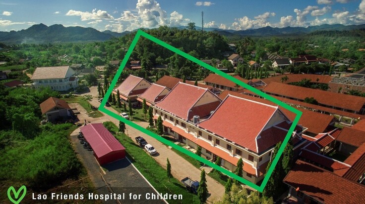 こちらが、ドローンで撮った建物の写真。囲われているところが、ラオ・フレンズ小児病院(LFHC)です。
