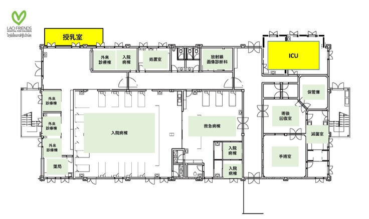 下の写真が内部の図面です。黄色の部分はこの数年で新しく増改築した部分となります。ICUは年々増える患者さんの受け入れに従い、重症な患者さんが、他の郡や他県から送られてくることが増えています。ICUができる前には、救急病棟の一部で受け入れていましたが、コロナの蔓延により、患者さんのベッドの間隔を広くとらなければならず、受け入れ可能な人数が限られるなど適切な救急医療を提供できなくなりました。また重症患者さんの対応も周囲のバタバタの中では、診療の質は下がることはたやすく想像できるでしょう。そこで、重症患者さんのためのICU