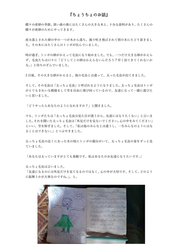 お父さんからNeeちゃんが息を引き取ったという連絡が入ったのは、その2日後でした。訪問時に持って行ったノートとカラーペンを使い、亡くなる前に「ちょうちょの物語」を書き(描き)残していたので見に来てほしいとのことでした。