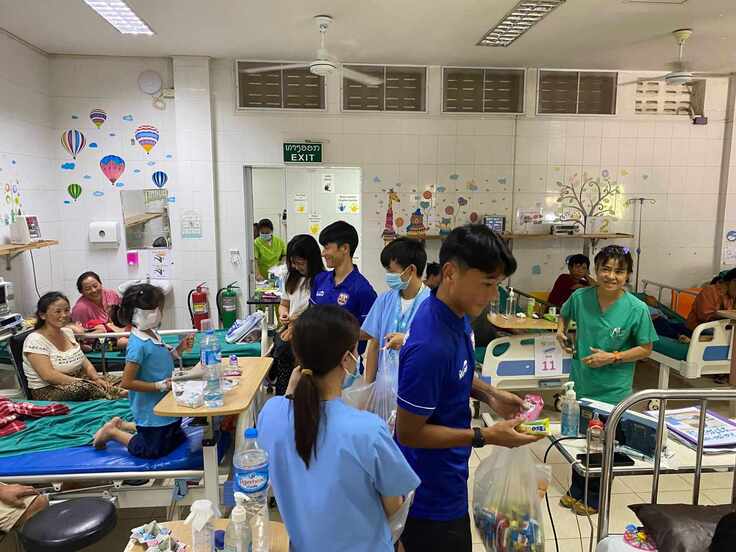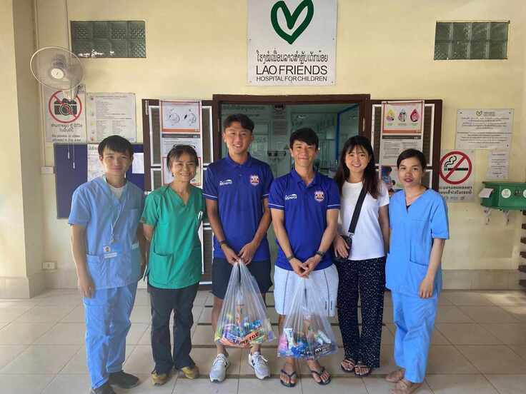 そして、ラオスへ戻ってきてからは、現地ルアンパバーンに拠点を置くサッカークラブ、ルアンパバーンFCに所属する日本人選手2名が、ラオ・フレンズ小児病院(LFHC)へ激励に来て下さいました。来て下さったのは、石川令君(写真右から3人目)とパートナーの絵梨子さん(写真右から2番目)、そして、渡邉宰君 (写真左から3番目)。