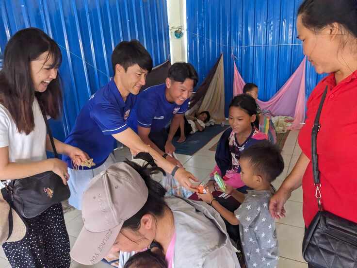 また、「!今年はもう一人日本人の選手がルアンパバーンFCに参加しているので、一緒に行きます!」とお聞きしていたのが、渡邉宰(つかさ)君でした。彼も世界各国でプレーをして頑張っている優秀な選手で、お会いできることをとても楽しみにしていました。子どもたちに優しい笑顔でお菓子を配ってくださいました。聞くところによると、学生時代から海外には興味があったそうで、マレーシアで学校や病院へ行かれない子たちを見て、色々と感じるところがあったそうです。とはいえ、当院のことは石川令君に聞くまでもちろん知らなかったそうですが、「知ることができて良かったです」と言っていました。