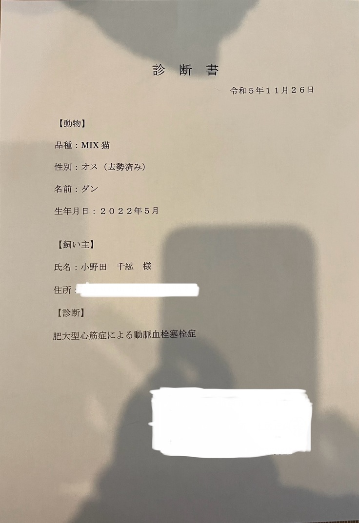 11/21の朝、ダンが下半身が動かない状態で見つかり慌てて病院に連れて行った所、肥大型心筋症動脈血栓塞栓症が見つかりました。不幸中の幸いにも完全に血が止まった訳ではないようで、少し足は動いていました。そして、1週間かかりつけの病院にて血栓を溶かす薬を摂取した方がいいと言われ毎日嫌いな病院を頑張りましたが、血栓はなくならず。