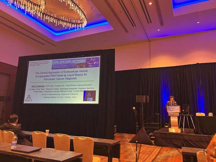 写真は2024年12月に米国・ハワイ州で開催されました米国膵臓学会・日本膵臓学会合同年次会で口演発表させて頂いた際のものです。今回のプロジェクトに関連する膵癌バイオマーカー研究の発表をさせて頂きました。本学は地方に位置する医科大学ではございますが、国内外の多施設の先生方のお力添えのおかげで、研究活動を続けることができております。共同研究などを通じてご指導、ご鞭撻を頂いた国内外の先生方に改めまして感謝を申し上げたいと思います。微力ではございますが、今後も胆道・膵臓領域の臨床・研究分野の発展に貢献できますよう、全力で務めて参りたいと思います。