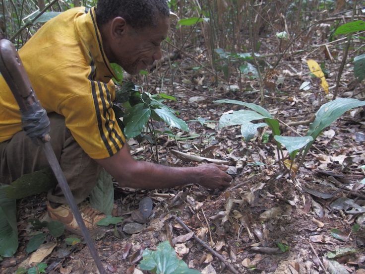 キャンプに着いて一息つく間もなく、バカの男性はわなを仕掛けに出かけます。現地ではくくりわなを使用していて、その場に生えているしなる枝や葉っぱ、樹皮などをとってきて、手際よく仕掛けとカモフラージュを完成させます。これを何度も繰り返して、数時間で30個ほどわなを仕掛けました。くくりわなは日本でも使用されているとてもシンプルな方法ですが、獲物のサイズとわなの大きさの微調整や、人間の匂いなど細部に気をつけなければなりません。