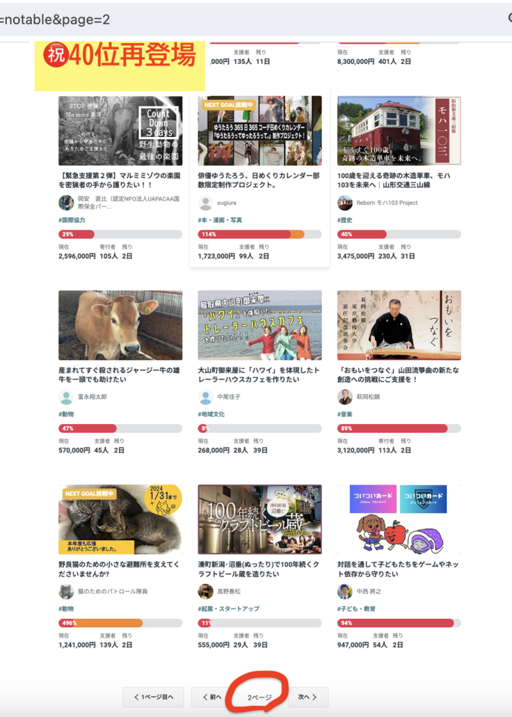 ご支援をくださる人数が増えるほど、アルゴリズムが働いて上位に行けるのだそうです(金額の伸び率だと思っていた岡安は迂闊でした…)。