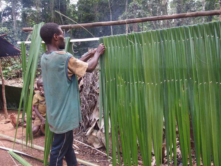 カメルーン東南部では、1世紀近くにわたって、先住民を対象とした定住・農耕の浸透、いわゆる近代化が推し進められてきました。それに伴い、それまでの遊動的な生活から、村で農耕に従事する割合が増え、現在は一年のうち数ヶ月は森で過ごし、残りは幹線道路沿いの集落で過ごす、という半定住的な暮らしを送っています。その結果、今まで植物によって支えられていた彼らの物質文化は、地方都市や隣国からやってくる商人たちが持ち込んだ、安価なプラスティック製品などに、少しずつとって代わられています。