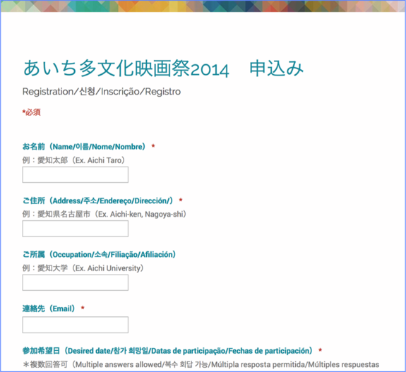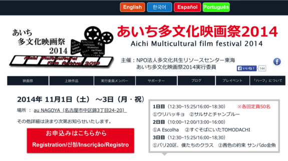 今回の上映作品に合わせて、チラシと申込みフォームを5カ国語(日本語、英語、韓国語、スペイン語、ポルトガル語)にしました。