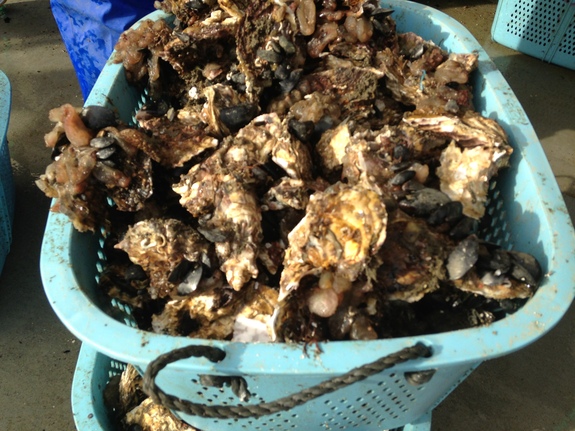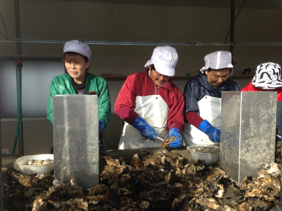 朝一番に福井さんと訪れたのは、津波の後再建し、この10月に稼働し始めたばかりの共同牡蠣剥き場。いま、最盛期を迎えた牡蠣を、お母さんたちが慣れた手つきでどんどん剥いていきます。中からプリップリの身がつるり。