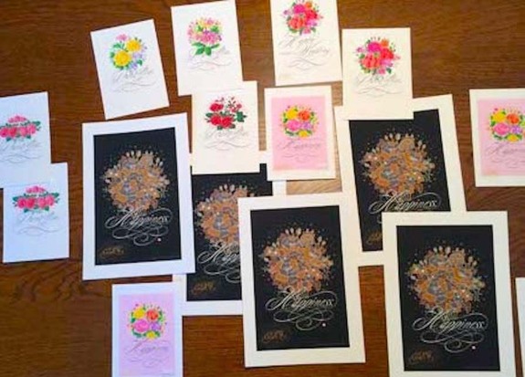今でも美しいカードや可愛らしいカードはたくさんありますが、日本独自の金箔を施した繊細な美しさとゴージャスさを兼ね備えたカードを見つけることは難しいと考えています。そこで、私自身が持つカリグラフィーのメッセージデザインと花束のデザインを融合させることで繊細な美しさを表し、そこに日本伝統の“金箔”を施すことでゴージャスさを演出した、オリジナルカードの作成を思い立ったのです。こうしたアイデアを実現するため、日本最大の金箔取り扱い会社にご協力頂き、2015年5月末の完成を目処に動いています。完成した品は、23-23 マーケティング・ディビィジョンのショップと私自身の個展での販売を予定しています。