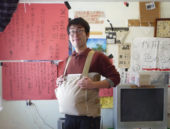 体にしっかりと固定できるようになっているので、耐えがたいほど重くはありませんでした。しかし、バックパックと併せて装着すると、背が縮むのではないかなと心配になるくらい重いです。実際に活動する際は、エプロンも上に着けて行きます。どういう理由でそのような格好をしているのか一目で分かるように、ポップでキャッチーなエプロンを作っていきます。
