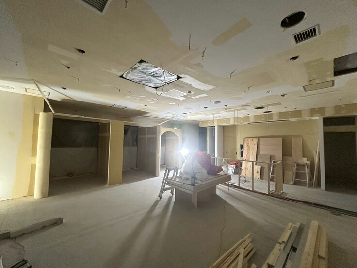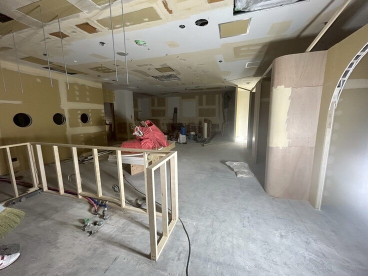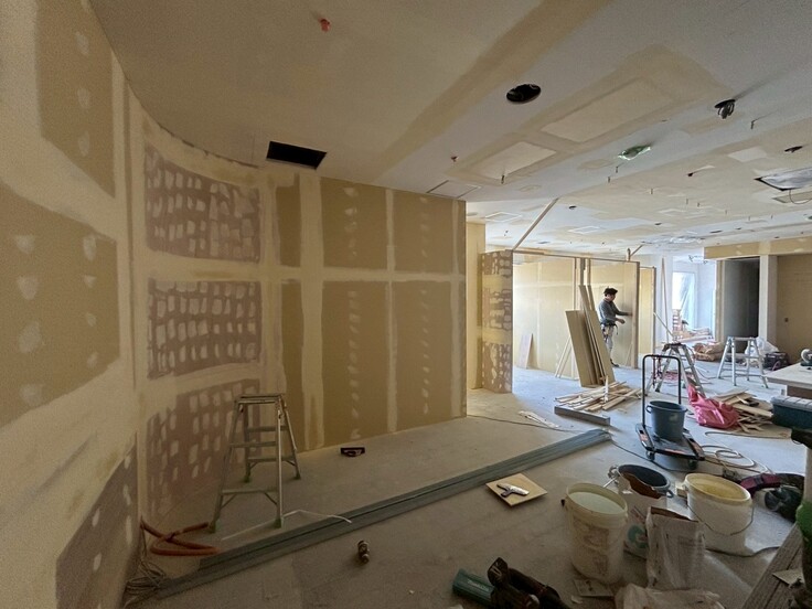 現場ではもう、クロス屋さんが壁や天井の表面を平らにするために、パテという材料を塗布する作業をしているのに・・・。