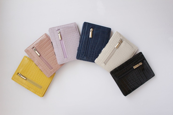 色は左うえから、イエロー、ピンク、パープル、ネイビー、グレー、ブラックと、自分好みで選べる6色。落ち着いた雰囲気のクロコダイル調で、普段から愛用している服装にも馴染みやすいのが魅力です。アニマルフリーで、オシャレも楽しんでもらいたいと思っています。