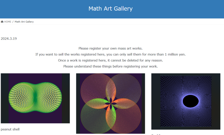 まずは、Math Art クリエイターの方々の作品を優先して投稿いただきます。そして、この Math Art クリエイターの方々が核になって、周りの人たちに指導いただき、さらに 投稿するMath Art 作品を増やしていきます。閲覧できる作品数になった時点で、この Math Art Gallery を一般公開し、一般の閲覧者を導くようにいたします。