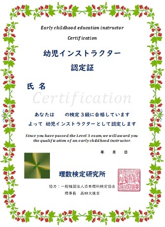 もちろん、数学の検定や英語の検定で3級に合格した場合でも、「幼児インストラクター」の資格を取りたいという方は申請すれば資格取得できるように検討しているところです。