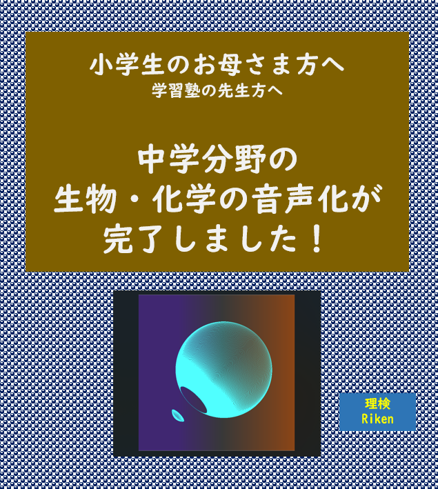 これは、理数検定研究所が中心になって、中学理科の生物分野と化学分野の音声化ができたので、小学生でも中学理科を学べる環境が整ったことをお知らせしているものです。