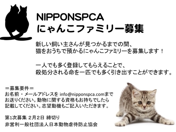 日本動物虐待防止協会と一緒に活動してくれるボランティアとして、登録させていただきます。日本動物虐待防止協会で預かる猫たちをご家庭に迎えていただき、新しい飼い主さんが見つかるまで、お世話いただきます。