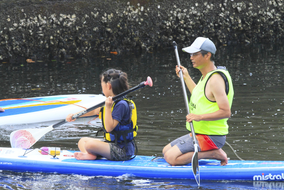 私たちは、私たちの使う水を守って行くためには、私たちも含めて、子どもたちと水を知る体験の場を増やす必要があると考えています。SUPは安全に、楽しみながら川や海を体験する素晴らしい場です。上手になって、子ども一人で乗りこなすこともできますし、写真のように子どもと一緒にボードに乗ることもできます。こんな体験を遠いところまで行かずに、横浜の中心部近くでできてしまうというのが、大岡川でのSUPです。一緒に漕ぎながら、水面から私たちの生活の場を見る。流れてくるゴミも含めて、子どもたちの豊かな感受性を刺激して、この水を汚さないようにしようという思いを感じてもらうことこそ、そして子どもと一緒に水を体験して食卓でもそのような会話が日常的に行なわれることこそ、ニッポンの豊かな水を次世代へとつないでいく大きなチカラになります。