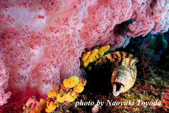 強面のウツボくんの怒号が聞こえますでしょうか? この写真は、東京湾の富津の沖合で撮影したもの。富津と言えば、横須賀の対岸。東京湾の中程です。ここにもおおきなソフトコーラル(柔らかいタイプのサンゴ)があり、まるで竜宮城の番人のようにこのウツボくんが睨みを利かせています。