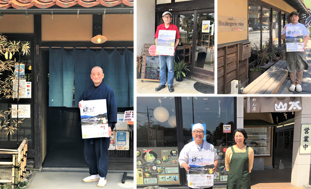 食事処小望月の岩石秀一さま(左、出雲市)、天然酵母パン ルバーブの小室浩司さま(真ん中上、出雲市)、ブーランジェリーミケの宇佐美さま(右上、出雲市)、山太の森山太史さま(右下、出雲市)からの応援写真をお届けいたします。
