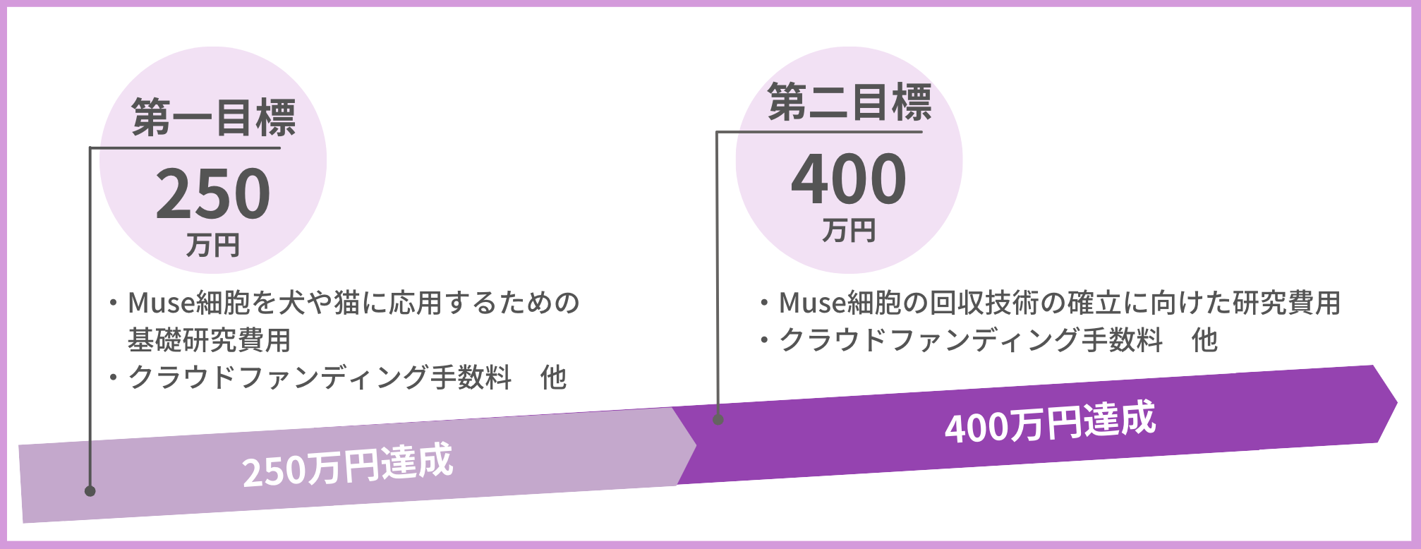 クラウドファンディングで募集する資金は、犬と猫のMuse細胞採取法の確立と特性確認、そして効率的な回収技術の確立に充てられます。