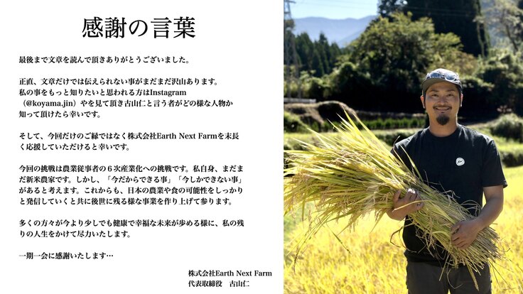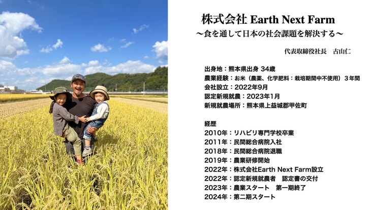 株式会社Earth Next Farm 代表取締役 古山仁 会社理念「食を通して日本の社会課題を解決する」 ▶︎無農薬無化学肥料栽培 ▶︎熊本県甲佐町にて栽培 ▶︎Instagramフォロワー1万人 Youtube登録者620人 日本の「食」は世界一です。土、水、環境が全て整っています。日本の食を海外に発信すると共に農業の魅力を今の若い人に少しでも伝わる様に活動を行なっています。 日本の「食」と「農業」を共に守り後世に伝えていきましょう。ご支援、ご協力の程宜しくお願い致します。