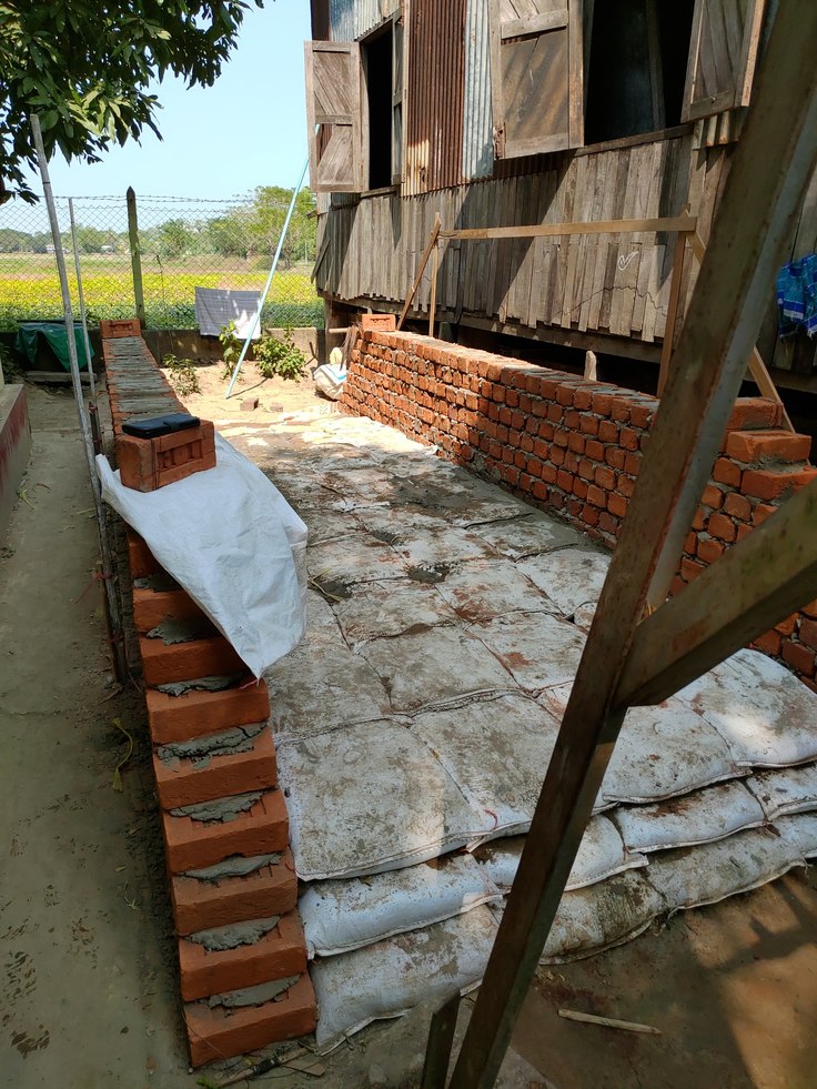 カンコン村の学校では毎日村人約15人が出てレンガ積みとソイルセメント土嚢積みが1/3まで進捗しました。