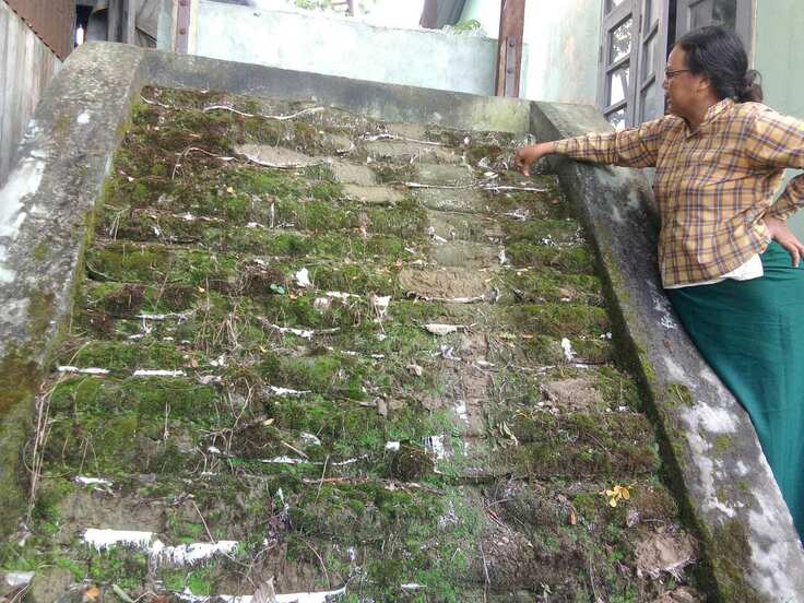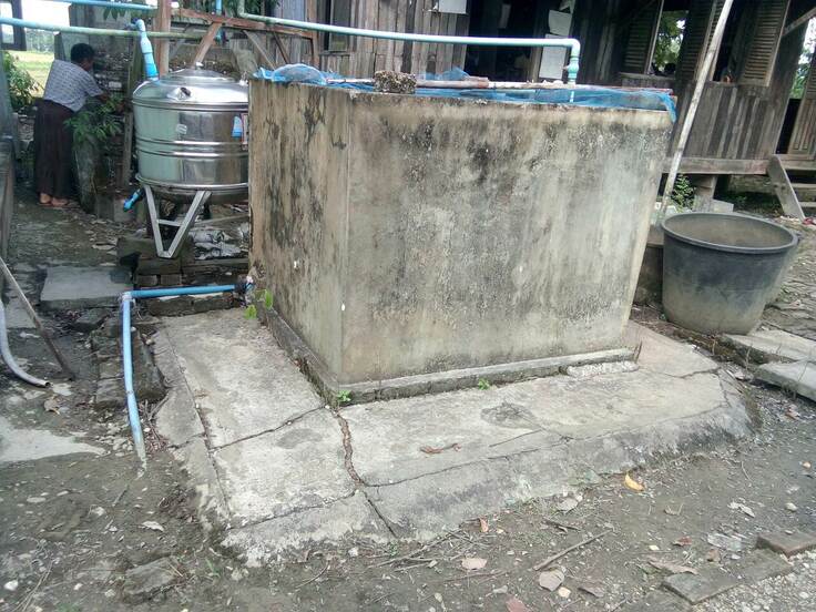 浄化された水は小さなタンクに移し替えられ学生たちの飲み水として使用されています。既設の貯蔵タンクに亀裂が生じたが補修されたようです。殺菌タンクの基礎は写真のように草が生えている状況で雨天には滑りやすくなっているなど改良が必要なようです。