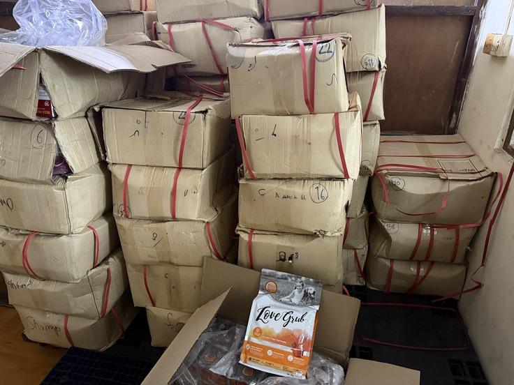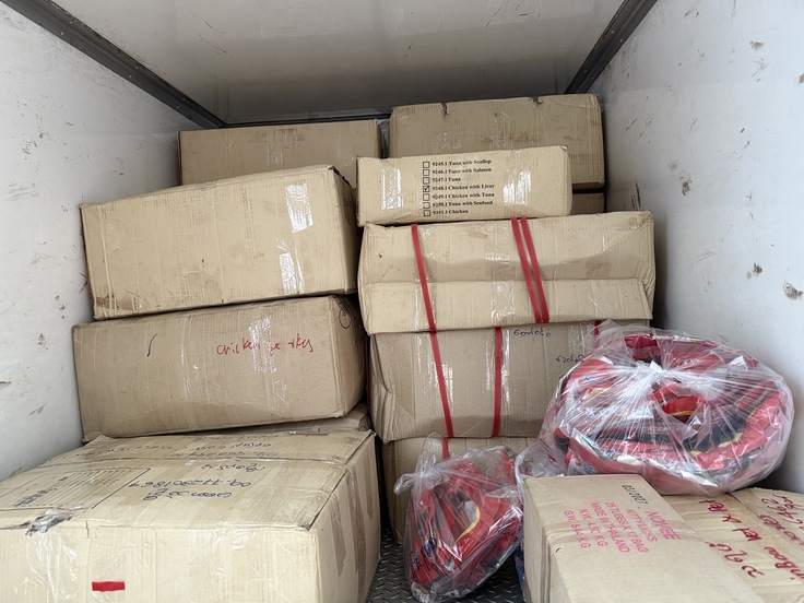 今回の物資は犬用猫用のドライフード約500kgと、栄養価の高い乾燥チキン、病気や老猫・老犬ように柔らかいペースト状のフード、チュールのようなおやつ、犬用歯磨きガム、私の会社から犬用のストレス発散用のかみかみのおやつも入れて発送しました。