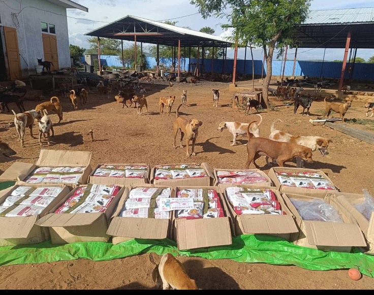 わんこと物資(この施設は乾燥地域にあるので、雨季のミャンマーでも雨が降りません)