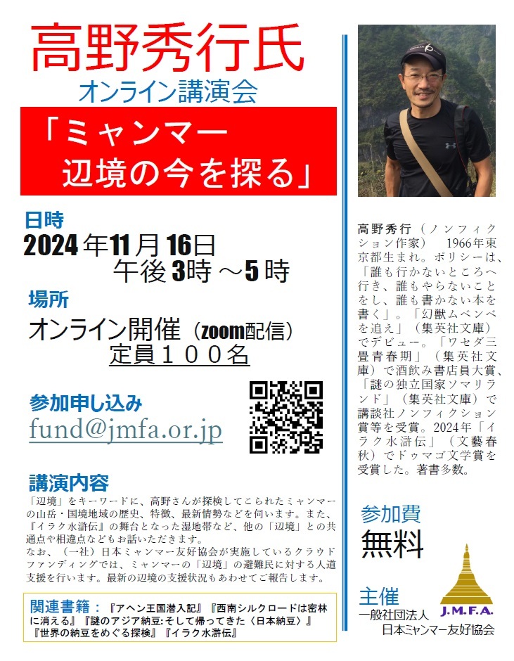 表題は「ミャンマー 辺境の今を探る」で、参加費は無料です。