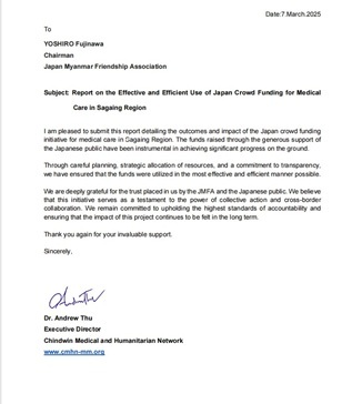 ザガイン地域の医療・人道ネットワーク「The Chindwin Medical and Humanitarian Network (CMHN)」と、マグウェイ地域の医療・人道ネットワーク「HEARTLAND UNION (HLU)」から、クラウドファンディングによるそれぞれ1,200,000円の支援に関するreportが寄せられました。