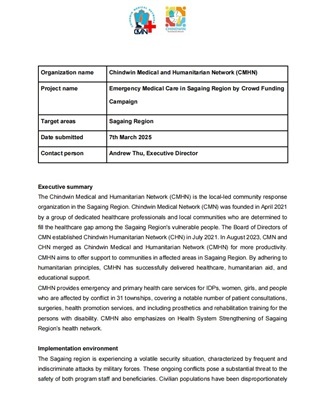 概要:チンドウィン医療人道ネットワーク(CMHN)は、2023年8月に、チンドウィン医療ネットワーク(CMN)とチンドウィン人道ネットワーク(CHN)が統合して設立された。