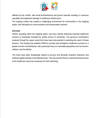 CMHN は、ザガイン地域の31の郡区の被災地で、医療、人道支援、教育支援を提供してきた。多数の患者の診察、手術、健康促進サービス、障害者向けの義肢装具およびリハビリテーション トレーニング、プライマリ ヘルスケア サービスの提供など。