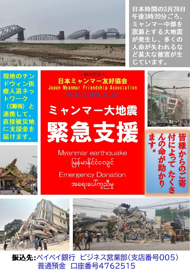 一般社団法人日本ミャンマー友好協会(JMFA)は、クラウドファンディングの支援先でもある現地のチンドウィン医療人道ネットワーク(CMHN)と連携して、マンダレーを含む地震被災地への緊急支援を開始します。https://www.cmhn-mm.org/