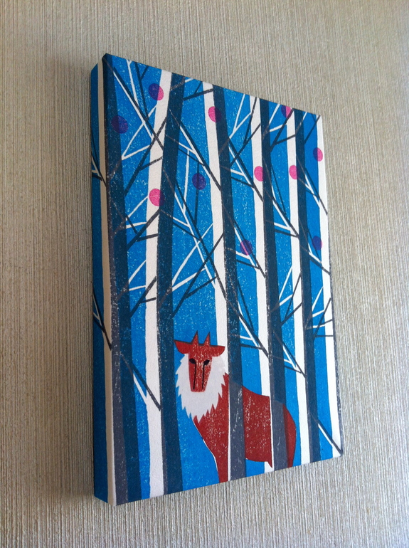 昨年ぐらいから、パネル仕立ての木版画というのを制作しています。額縁に入れて飾るのもいいですが、インテリアとしてもっとおしゃれなものをと考えて、思いつきました。軽いので、画鋲2本で壁にかけることができます。また、小さいものは、100円均一のミニイーゼルに立ててもいいですね。