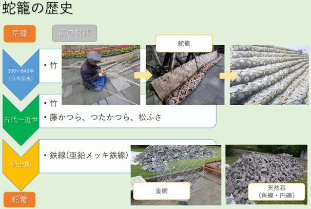 古事記(712年)にはすでに利活用の記載があるようで、日本への伝来は380年〜640年頃だそうです。古墳時代~飛鳥時代にあたるでしょうか。主には河川堤防等の洗掘箇所の防御資材を主に用いられてきました。時間が経って、明治期には鉄線が用いられるようになり、昭和に入り、1954年には亜鉛メッキ鉄線製蛇籠が規格化(日本工業規格(JIS A 5513))されています。