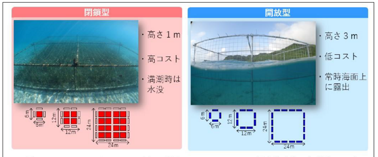 「開放型」の柵はある程度まとまった範囲を守ることができ、高潮位まで対応しているので開花させることができますが、景観の理由で設置個所は限定されます。また、海水の塩分や強い日差し、さらに潮位の変化にさらされることで経年劣化が予想されます。また台風などによる破損も想定してウミガメが侵入する前に迅速に修理できるための費用も必要になります。