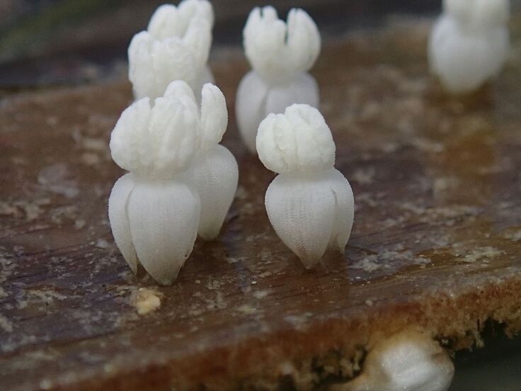 その大きさはお米の粒くらい。バナナの皮をむいたように花びらをくるっと裏返し、海水を抱え込んで表面張力を利用しながら花粉を高々と持ち上げて水面の上に立ち上がるのです。