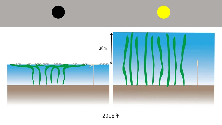 まず、満月と新月の干潮時の潮位を調べてみると、おなじ大潮なのに新月のときの方が30㎝も低かったのです。満月の大潮だったら例え開花しても雌花が水中にあるので受粉できません。