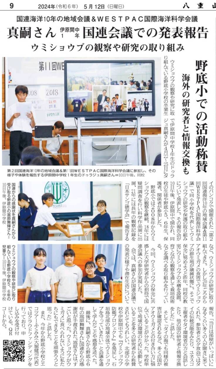 4月に国連海洋科学会議に野底小学校を代表して出席してきたシンジくんは、中学生になったのでその報告会は伊原間中学校で行いました。野底小出身の同級生もいますし、先輩たちの中にもウミショウブの活動をしてきた生徒がいます。