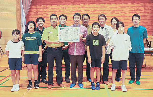 自然共生サイトの認定授与式が野底小学校の体育館で行われました。