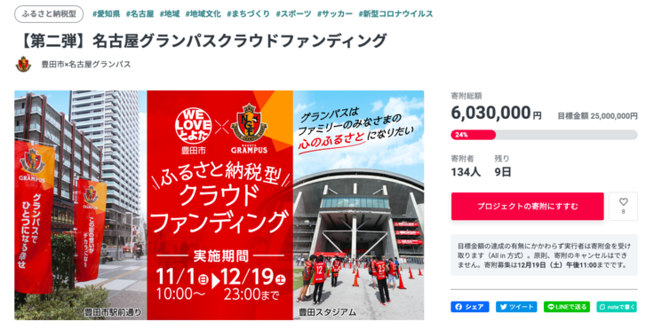 11月1日より始まりました豊田市×名古屋グランパスのふるさと納税型クラウドファンディングへの挑戦も、残り本日を含めて10日となりました。