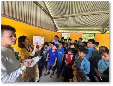 プロジェクトメンバーである管理栄養士の鎌田彩乃と、ミナの弟のサロジが中心となって、ネパール語で指導し、手作りの紙芝居を使って子どもたちに歯磨きの方法を教えました。